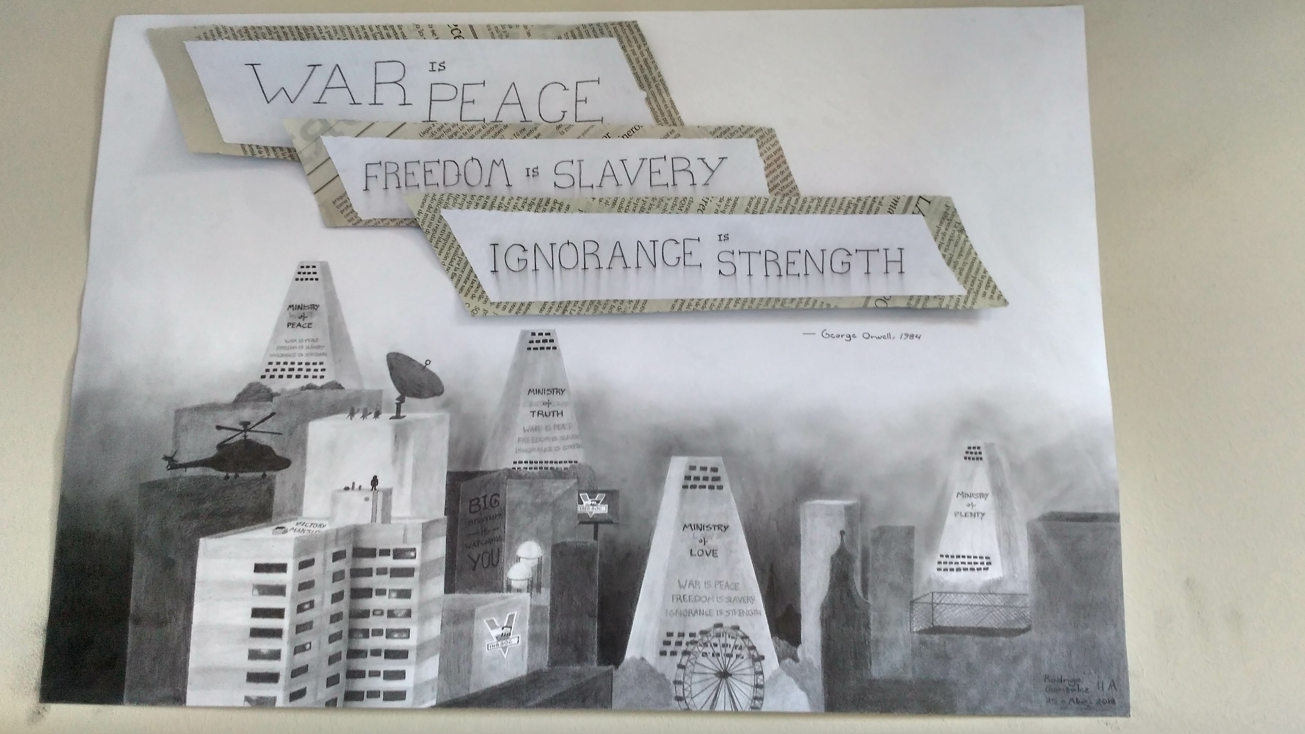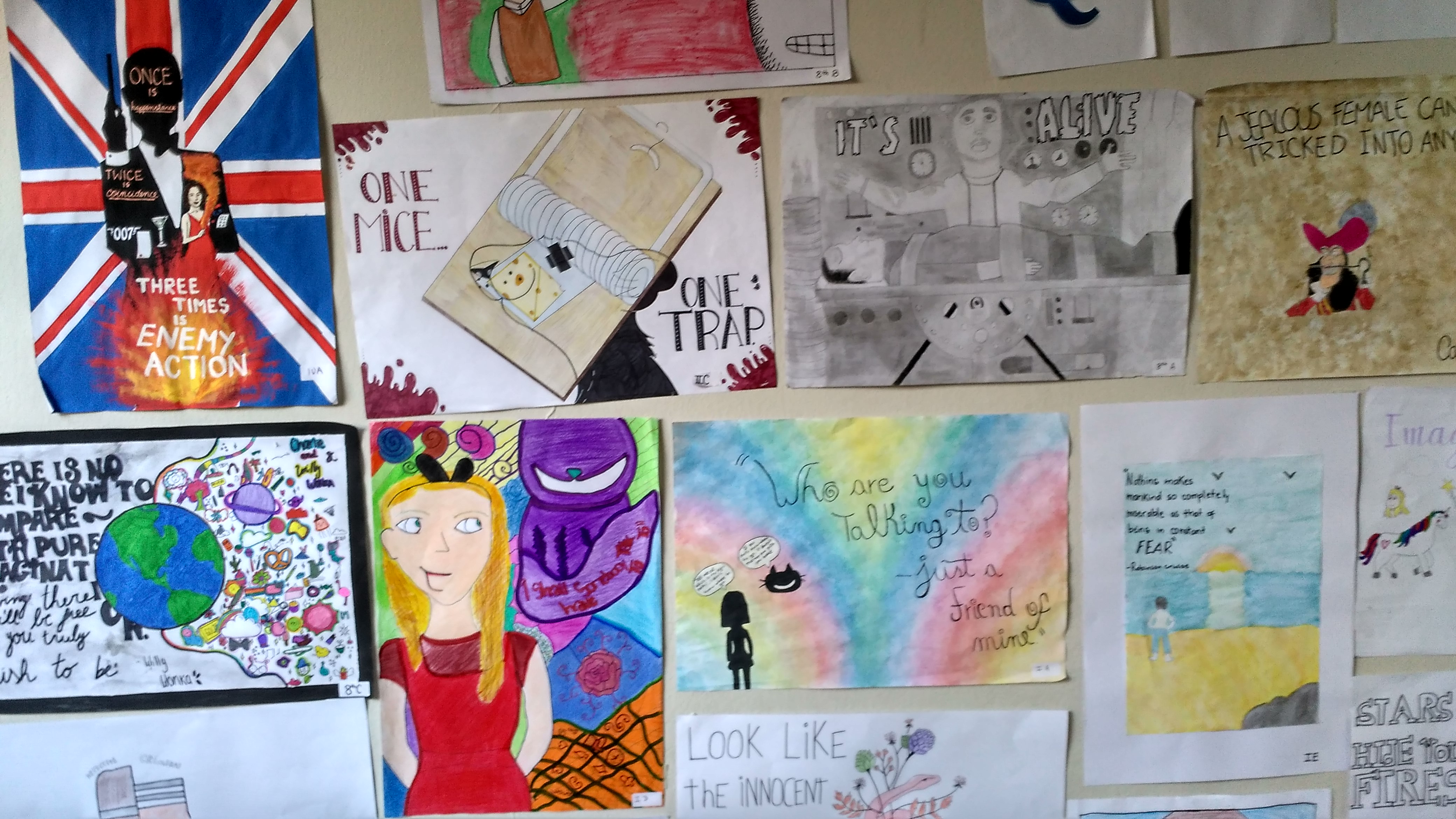 Las murallas de la entrada al edificio de enseñanza media amanecieron con coloridos e inquietantes dibujos realizados por estudiantes, sobre alguna cita importante aparecida algún libro clásico de origen británico.