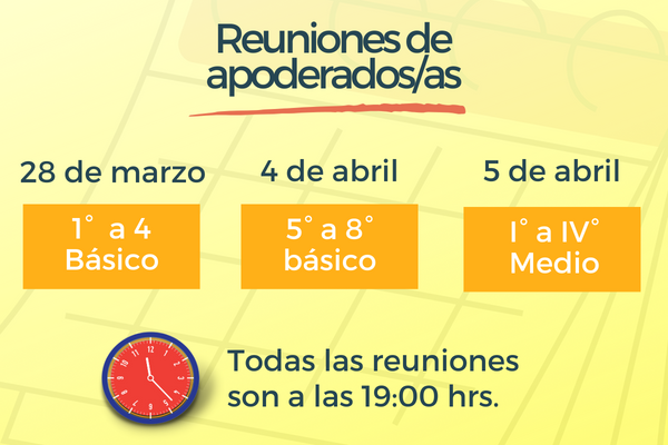 Les compartimos las fechas de las reuniones de apoderados para este inicio de año. La reunión de 1° básico tiene un formato diferente y será informado mediante correo a los apoderadas y apoderadas de nivel.